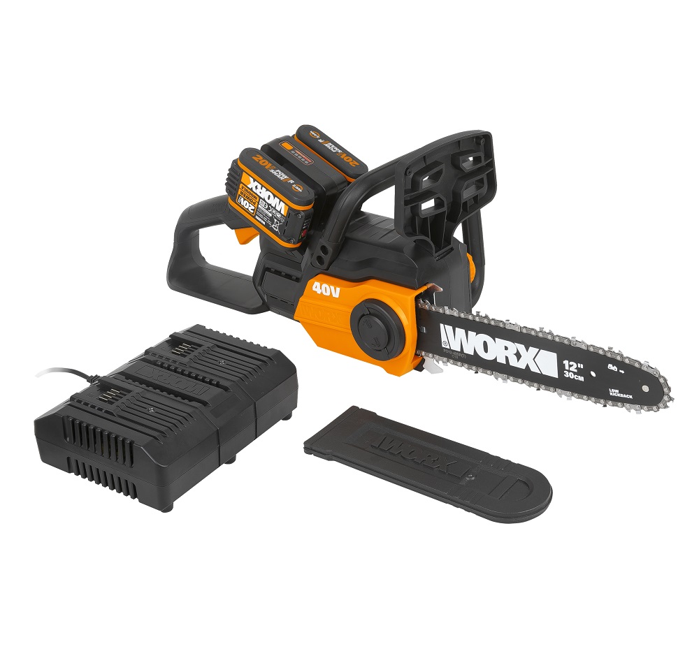 The Worx WG381E is a dual battery cordless chainsaw that simultaneously uses two 20V WORX batteries for extra power and runtime.